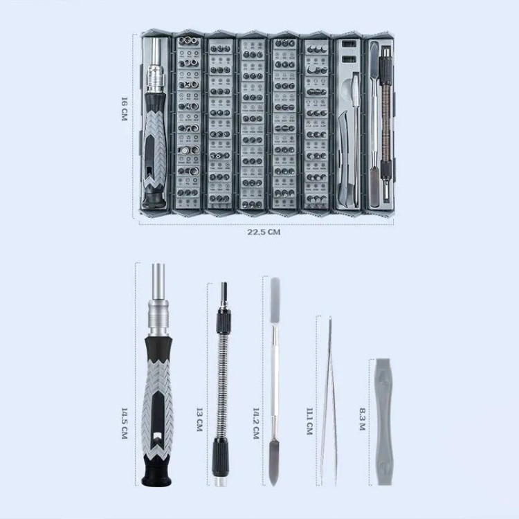 تعداد قطعات: این بسته شامل 126 قطعه مختلف است که به شما این امکان را میدهد تا با تنوع بالای ابزارها، بهراحتی به انجام انواع تعمیرات و مونتاژها بپردازید.
