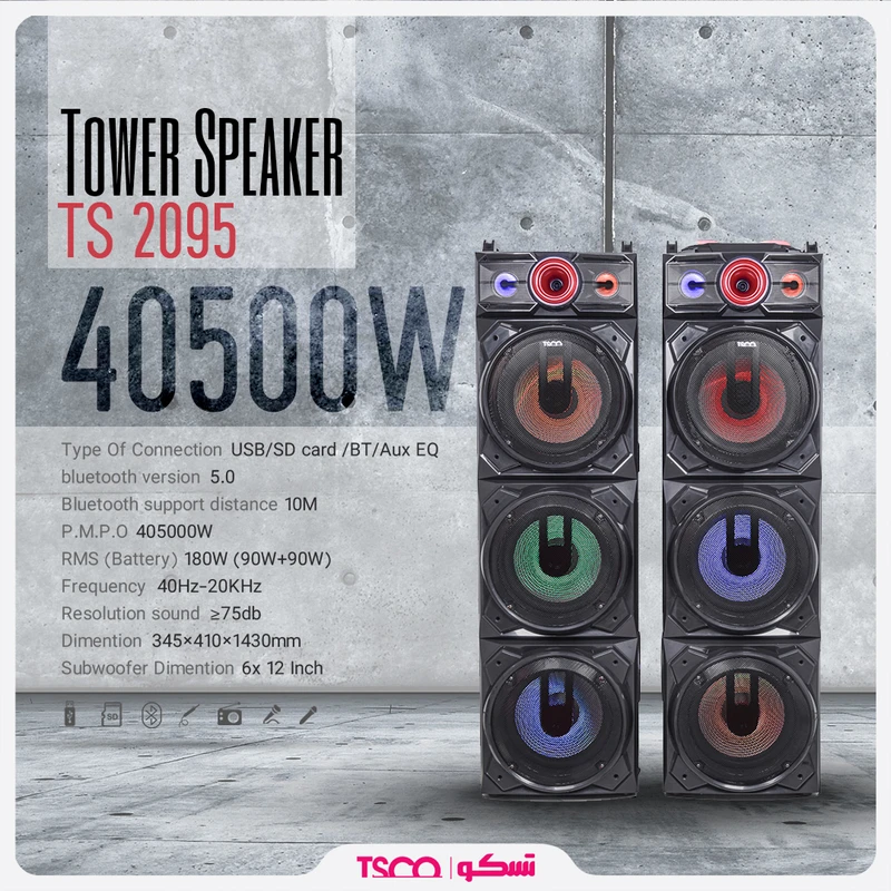 این کالا یعنی اسپیکر بلوتوثی تسکو مدل Tsco TS 2095 به تازگی روانه بازار شده است دارای قدرت فوق العاده 180 وات(2 عدد اسپیکر 90وات) می باشد